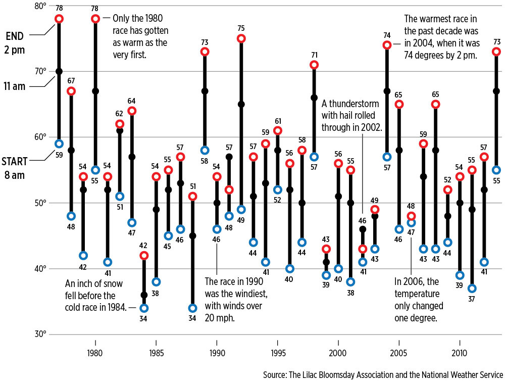 A history of the temperatures and weather conditions during the annual Bloomsday road race.
